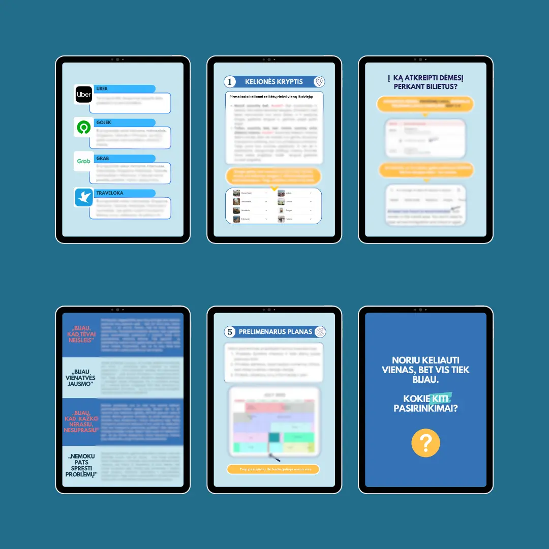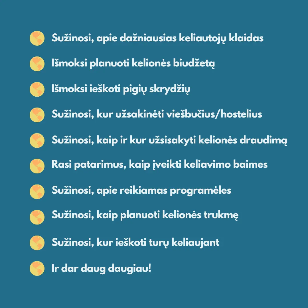 Parodysiu, per kur ir kaip ieškoti pigių lėktuvo bilietų, kaip įveikti solo kelionės baimes, kur vieškoti pigesnių viešbučių ir pan. Visą šią informaciją galėsi pritaikyti visoms savo ateities kelionėms. Įkvėpsiu tave kelionėms ir pasirūpinsiu, kad tavo pirma solo kelionė būtų tobulai suplanuota!